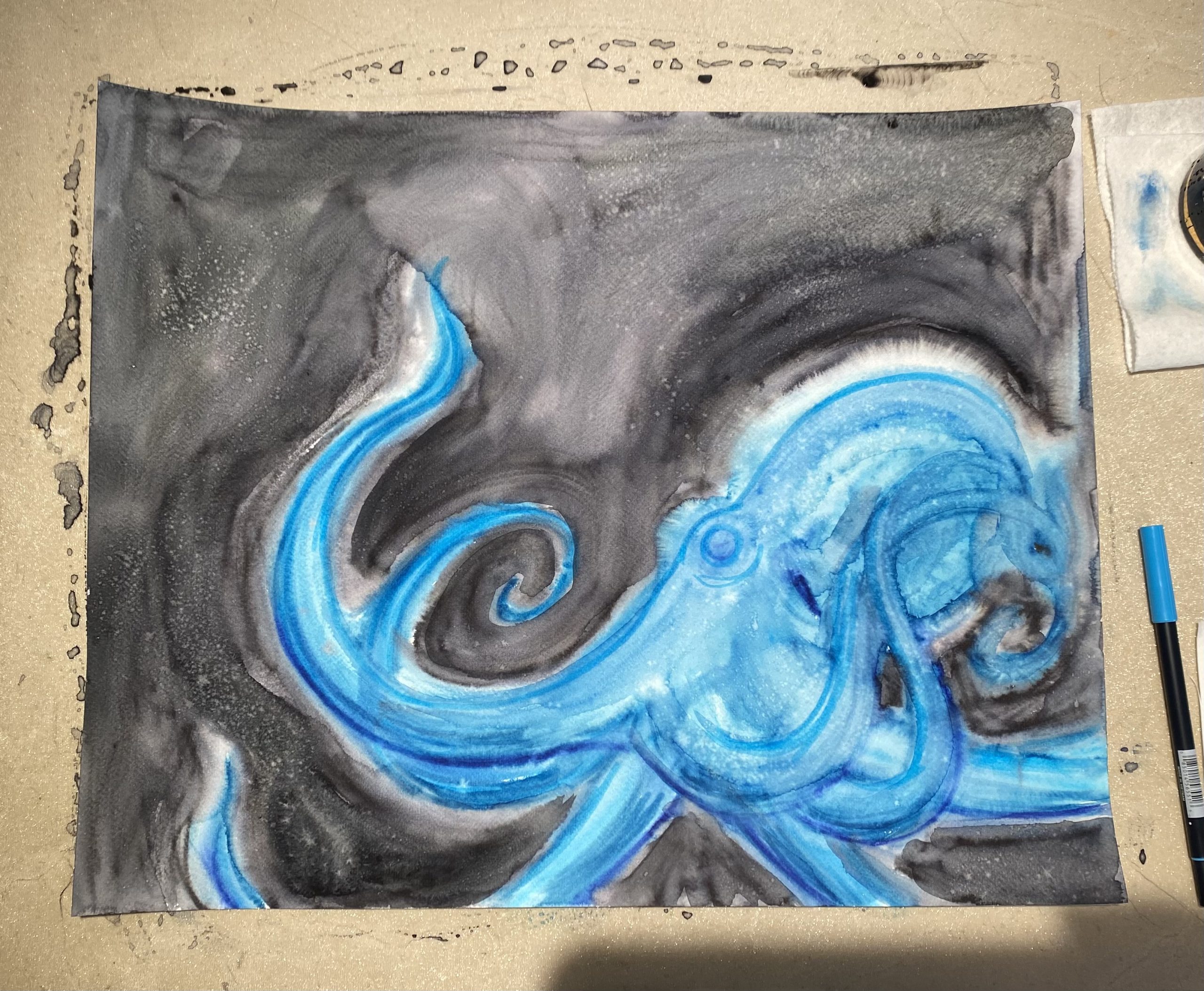 After that first round is dry I might go in again with another layer of color and marker or treat it more traditionally and start painting over it with regular watercolors.